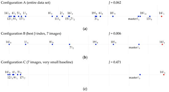 The experimental results presented in Section 4 showed that beamforming can be successfully applied to the subset of the available images characterized by the best J-index. To further point out the role played by the J-index, other possible subsets are herein analyzed. Figure 9a shows the distribution of samples for the entire data stack between and . In the figure, the following notation is used: slave#|κj to indicate, in addition to the slave number, also the relevant pulse number. It is evident that the distribution of samples for this configuration when all the images are used, referred to as Configuration A, is far from being uniform. If one indicates as Configuration B the one leading to the best value of the J-index, including just 7 out of 19 slaves, the corresponding distribution (Figure 9b) is much more uniform. Finally, one can consider another configuration of 7 images, indicated as Configuration C (Figure 9c) (e.g., showing very limited baselines among some passes). Figure 9 indicates J-index values for all the selected configurations.