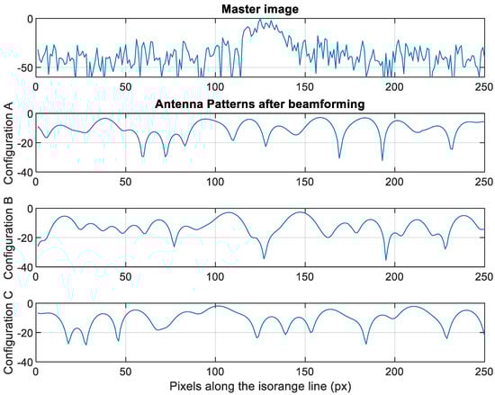 To further compare the selected configurations, the corresponding array patterns resulting from the beamforming are shown in Figure 10. Better null-steering capabilities are obtained when the J-index is minimized. The array pattern in this case shows that the applied null reaches a much lower value and the application of the null affects a larger image portion around the ambiguity (see Configuration B in Figure 10). The computed values of AASR further confirm the validity of the proposed approach.