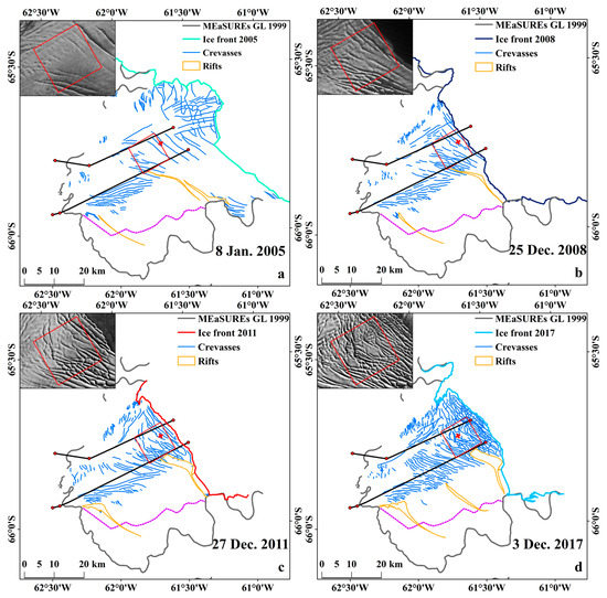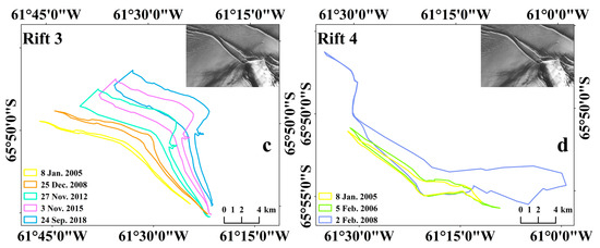 - Larour, E.; Rignot, E.; Aubry, D. Processes involved in the propagation of rifts near Hemmen ice rise, Ronne ice shelf, Antarctica. J. Glaciol. 2004, 50, 329–341. [Google Scholar] [CrossRef][Green Version]