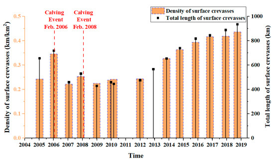 | Year | Retreat Distance (km) | Rift 1 | Rift 2 | Rift 3 | Rift 4 | Rift 5 | Crevasses Length (km) | Annual Ice Flow Velocities (m/year) | |||||