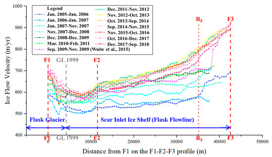 - Wuite, J.; Rott, H.; Hetzenecker, M.; Floricioiu, D.; De Rydt, J.; Gudmundsson, G.H.; Nagler, T.; Kern, M. Evolution of surface velocities and ice discharge of Larsen B outlet glaciers from 1995 to 2013. Cryosphere 2015, 9, 957–969. [Google Scholar] [CrossRef]