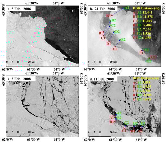 - Scambos, T.; Ross, R.; Bauer, R.; Yermolin, Y.; Skvarca, P.; Long, D.; Bohlander, J.; Haran, T. Calving and ice-shelf break-up processes investigated by proxy: Antarctic tabular iceberg evolution during northward drift. J. Glaciol. 2008, 54, 579–591. [Google Scholar] [CrossRef]