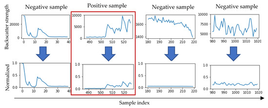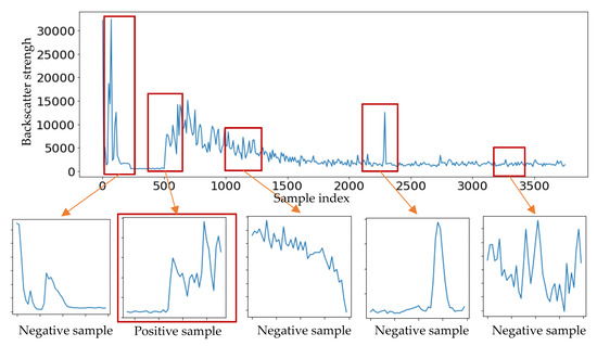 To establish the sample sets, the positive and negative samples need to be selected from raw sonar backscatter strength data sequences. The positive samples can be detected using the traditional method with manual intervention, whereas the negative samples should contain the samples in the water column area, those containing noise, and those in the seabed area, as shown in Figure 2.