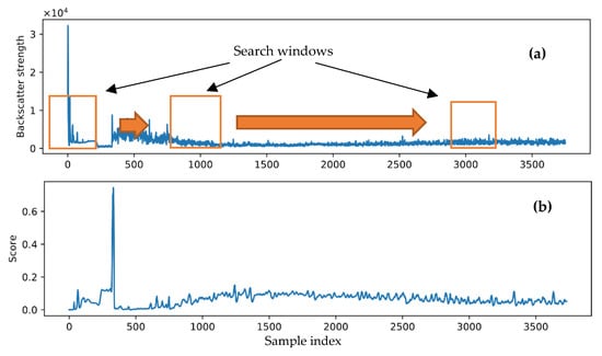 By finding the first echo that reaches the seabed, the purpose of bottom tracking aims to accurately obtain the sonar height from the seabed, then geocode the sonar image, and fulfill other applications. Given that the trained network model can effectively understand the characteristics of the input samples, bottom tracking can be accomplished via the 1D-CNN recognition of local backscatter strength sequences. By traversing the ping data sequence in the propagation direction, the trained 1D-CNN recognizes the local backscatter strength sequence in each search window, and the predicted score of each local sequence can be obtained, as shown in Figure 5. The window size should be the same as the sample size.