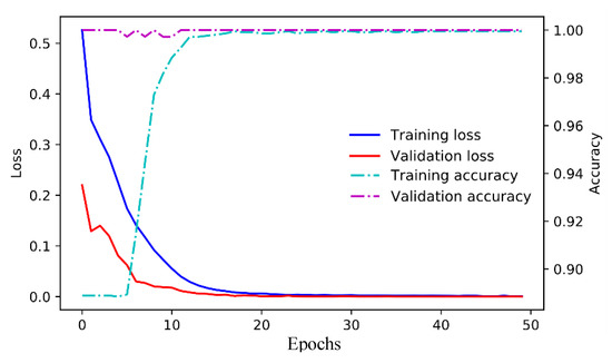 The sample set was normalized, according to Equation (1), and was imported into the network as the input layer. The corresponding label (1: positive, 0: negative) was imported as the output layer. During the training, the samples were randomly divided into training and validation sets in a 70–30% proportion. The 1D-CNN (Figure 4) was trained to learn the variation features of the data samples. The training and validation accuracies improved as the training epoch increased, as shown in Figure 11.