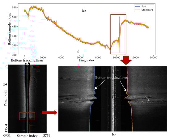 A side scan sonar can rapidly obtain large-area seabed images, has been widely used in seabed investigation, and plays an important role in seabed target detection [1,2,3,4] and investigation as well as research of the seabed ecological environment [5,6] due to its low cost and simple installation. A side scan sonar is usually dragged by a towing line to get close to the bottom of the sea to obtain high-resolution seabed images. Although the depth of the side scan sonar can be obtained by using depth sensors, the height of the sonar from the seabed cannot be accurately obtained [7]. Inaccurate sonar heights will lead to inaccurate geocoding sonar images [8], confuse the water column information with the seabed information, and cause serious problems in applications of target recognition and segmentation [9,10,11], image interpretation [12,13], and seabed sediment classification [14,15,16]. The bottom tracking of side scan data can accurately obtain the sonar height from the seabed by finding the first echo that reaches the seabed. Meanwhile, real-time bottom tracking can quickly detect changes in sonar height and seabed terrain, and enhance the safety of sonar equipment and ship navigation.