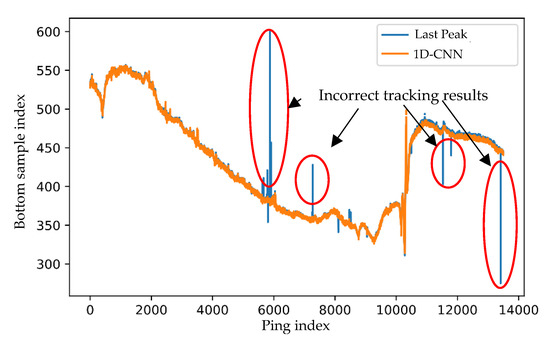Bottom tracking results obtained by using the last peak method and 1D-CNN.