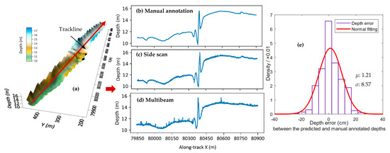 Depths comparison between the manual annotations, bottom tracking results, and multibeam bathymetric data. (a) This area shows the local seabed terrain, (b–d) show the depth sequences tracked by the manual annotations, predicted by the side scan data, and measured by using the multibeam sonar, respectively, and (e) shows the histogram and normal fitting (with the mean μ as 1.21 cm and standard deviation σ as 8.57 cm) of the depth errors between the predicted (c) and manual annotated (b) depths in centimeters.