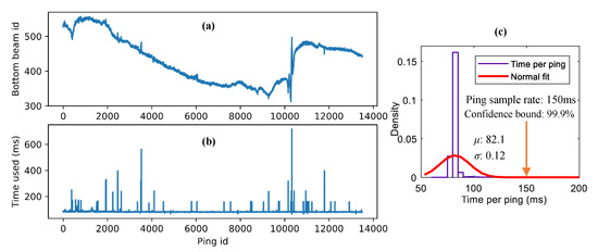 To verify the real-time performance of the proposed method, the spend times of each ping were recorded during the bottom tracking experiment. The bottom tracking results and time sequences are shown in Figure 16a,b, respectively, whereas the spend times were statistically analyzed to evaluate the real-time performance, as shown in Figure 16c.