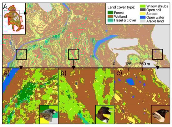 Habitat map resulting from high-resolution VIS-NIR-SWIR remote sensing product. Proportions of habitat class per 25 ha grid cell were used as covariates in the distance-sampling models for each species. Exemplary representation of favored habitat types as indicated by the bird image background color are shown for Black-faced Bunting (a), Yellow-breasted Bunting (b), and Ochre-rumped Bunting (c).