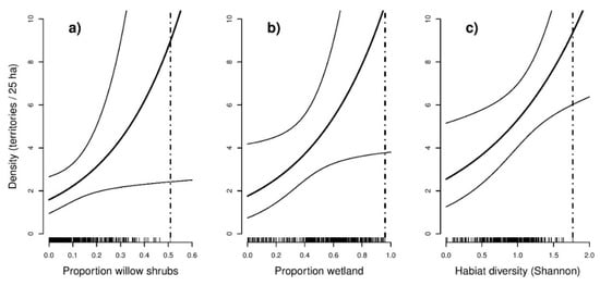 Predicted abundances per grid cell (territories/25 ha) from the models receiving the most support. The Yellow-breasted Bunting model included percentage of willow shrubs as abundance effect (a), the Ochre-rumped Bunting model included percentage of wetland as abundance effect (b), and the Black-faced Bunting model included the Shannon’s diversity index as abundance effect (c).