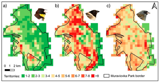 Based on the retrieved results, different habitat situations can be paralleled with species abundances. Near the Amur river, in the north-western part of the study area, there was a small-scale mixture of different habitat types and high portions of willow shrub habitats, considered to be highly appropriate for the species Black-faced Bunting (a) and Yellow-breasted Bunting (b). The Ochre-rumped Bunting (c) preferred more open areas dominated by wetland e.g., in the north-eastern part of study area. The predicted species-specific abundances per grid cell (Figure 6) coincided well with the spatial patterns of the habitat types found to be important in the modelling procedure. For the entire study area, the total population size estimates (95% confidence limits in brackets) based on the best models and the complete habitat map for each species were 706 (415–1249) territories for Yellow-breasted Bunting, 1445 (756–2855) territories for Ochre-rumped Bunting, and 1282 (928–1787) territories for Black-faced Bunting.