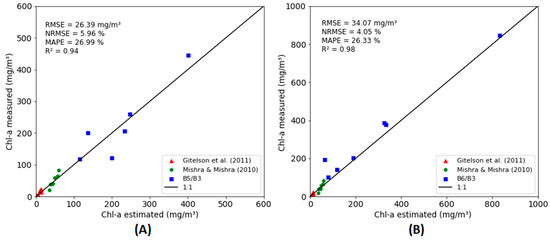 | Class 2 (19.51 ≤ chl-a ≤ 87.63) | Mishra and Mishra [69], B5 and B4 bands | Exp | 7 | 23.35 | 0.93 | 12.09 | 19.05 | (30.67 5682.47) |