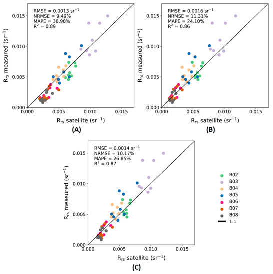| Band | MAPE (%) | NRMSE (%) | R2 | RMSE (sr−1) | MAPE (%) | NRMSE (%) | R2 | RMSE (sr−1) | MAPE (%) | NRMSE (%) | R2 | RMSE (sr−1) |