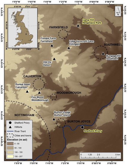 Shelford Priory was a small Augustinian monastery founded during the reign of King Henry II, between AD 1154 and 1189, and which housed up to 14 canons [17,18]. It was located close to the south bank of the River Trent in Nottinghamshire, U.K. at 19 m asl (Figure 1), and was suppressed during the English Reformation in 1536. After the complex ceased to be used as a religious house it was sold to the Stanhope family who created a house which was damaged during the English Civil War and repaired in 1678. Recent investigations [19] have shown that the current farmhouse was almost certainly the monastic ‘prior’s lodgings’ and retains a considerable amount of the original medieval building. The remainder of the monastery was probably robbed for stone and destroyed.