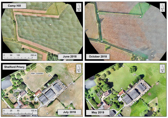 Site conditions at Camp Hill and Shelford Priory as visible in RGB imagery (white crosses show the location of ground control targets when used).