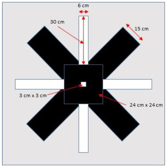 A range of geometric designs and materials were explored, and the most effective design for conditions in June was found to comprise a double cross pattern constructed from black and white corrugated polypropylene sheets (2 mm thick) with a large black square and smaller white square in the centre (Figure 4). Although this was effective in conditions in June, for the survey in October 2018 it was discovered to be less visible in the thermal data, and for the second survey at Shelford Priory in May 2019 an additional, and independent, cross target made from aluminium foil, with the same dimensions as the larger black cross used in the multisensor target, was tested and found to be more easily identifiable in thermal imagery than black polypropylene (see Figure 6).
