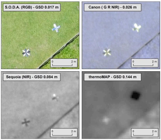 Appearance of multisensor ground control target in imagery collected by the senseFly Sensor Optimised for Drone Applications (S.O.D.A.), Parrot Sequoia and senseFly thermoMAP at approximately 75 m above elevation data (AED) (Shuttle Radar Topography Mission (SRTM) data).
