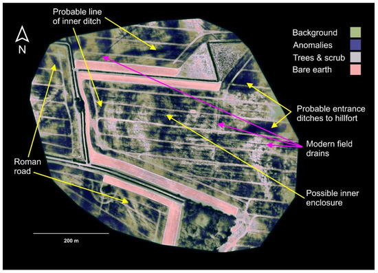 Multispectral and thermal imaging are comparatively recent developments in the archaeological survey toolkit and the availability of UAVs has further enabled the capture of very high spatial resolution imagery—vital for the detection of subtle, man-made features such as buried walls and ditches [24,25,26,27].