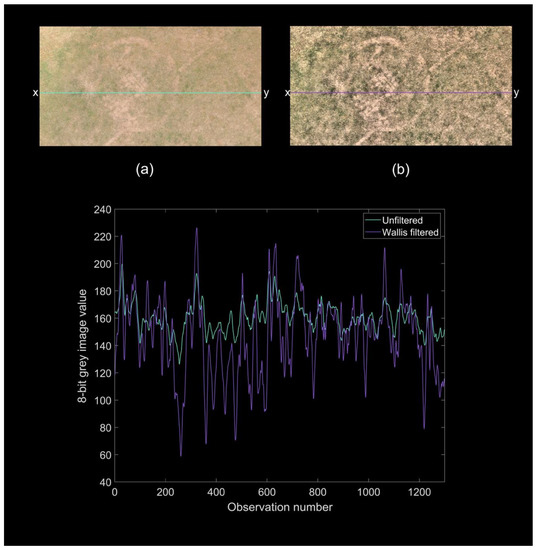 A denoising filter was applied to the thermal imagery datasets for Camp Hill in order to separate the signal data from spurious crop canopy effects which were evident in the RGB imagery (see Figure 7). The technique found to be the most useful was non-local means denoising, a filter which protects image texture. The average value of pixels NLu(p) is evaluated by windowing across the entire image, first searching the image for pixels that resemble those requiring denoising [67,68,69] and output is achieved by performing a weighted averaging of neighboring pixels, where the weights are computed using image patches. It is given by: