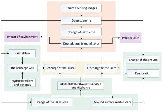 There are a large number of lakes with beaded distribution in the semi-arid areas of the Inner Mongolian Plateau, and some of them have degraded or even disappeared during the past three decades. We studied the reasons of the disappearance of these lakes by determining the way of replenishment of these lakes and the impact of the natural-social environment of the basin, with the aim of saving these gradually disappearing lakes. Based on remote sensing image and hydrological analysis, this paper studied the recharge of Daihai Lake and Huangqihai Lake. The deep learning method was used to establish the time-series of lake evolution. The same method was combined with the innovative woodland and farmland extraction method to set up the time-series of ground classification composition in the basins. Using relevant survey data, combined with soil water infiltration test, water chemical, and isotopic signature analysis of various water bodies, we found that the Daihai Lake area is the largest in dry season and the smallest in rainy season and the other lake is not satisfied with this phenomenon. In addition, we calculated the specific recharge and consumption of the study basin. These experiments indicated that the exogenous groundwater is recharged directly through the faults at the bottom of Daihai Lake, while the exogenous groundwater is recharged in Huangqihai Lake through rivers indirectly. Large-scale exploitation of groundwater for agricultural irrigation and industrial production is the main cause of lake degradation. Reducing the extraction of groundwater for agricultural irrigation is an important measure to restore lake ecology.