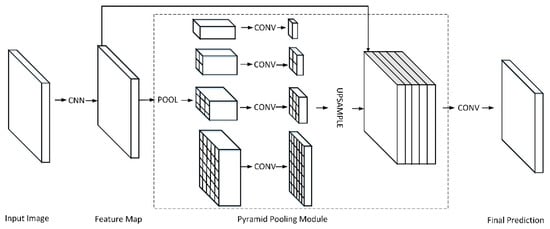 Therefore, for the input image in Figure 3, we used a pre-trained ResNet model with an extended network strategy to extract the feature map. The final feature size is 1/8 of the input image, as shown above Figure 3. This work utilized the pyramid pooling module Figure 3 to obtain context information for the above feature map. The pyramid pooling module was divided into four levels, and the pooled kernel size is the whole, half, and small parts of the image. Eventually, they can be merged into global features. Then, in the final part of the Figure 3 module, this study connects the global features and the original feature map. Finally, the final prediction map was generated by convolutional layers in Figure 3.