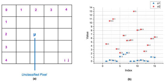 (a): Schematic diagram of unclassified pixel processing; (b) Standard deviation of farmland (σ1) and woodland (σ2) with DEM.