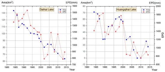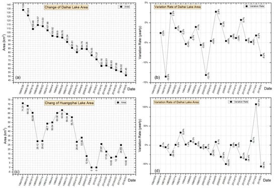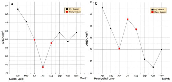 After the above stage, construction of a yearly time-series of the water surface areas on Daihai Lake and Huangqihai Lake are displayed in Figure 5.