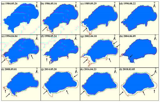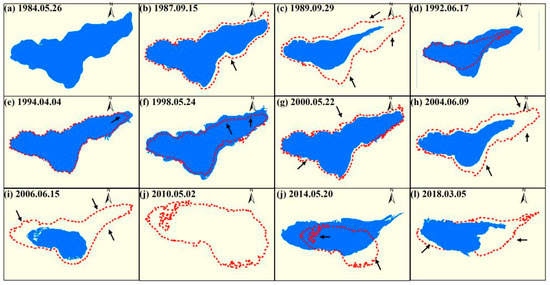 In the above paragraphs, we described the changes in the two lakes in terms of time distribution. Then, we continued to observe the characteristics of water surface changes for each lake from a spatial perspective. We selected some year images with significant changes and drew diagrammatic sketch of the water surface change on Daihai Lake and Huangqihai Lake respectively. Figure 6 and Figure 7 show the spatial changes of each lake.