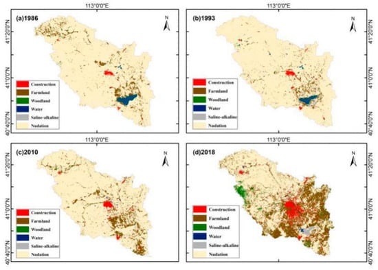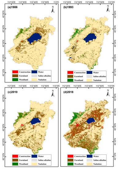 The area of the construction increased in Daihai basin year by year. Before 2010, the area was stable relatively and expanded 10-fold from 2010 to 2018 (Figure 8). Distribution of the construction are mainly located at Liangcheng county in southwest of the lake, which began to scatter around the lake and the county after 2010. The farmland area was stable about 150 km2 until 2010, but the area of 1998 showed a three times increase compared to 1993. Because the local government adopted the project of the expansion of planting area in order to increase economic income. The woodland area has been stable relatively between 50 km2 and 150 km2 except in 1998. The local government’s excessive afforestation plan gave rise to the burst increase of the water consumption in the basin. Regrettably, the growth resulted in excessive water consumption in the region, which cannot sustain the growth of these trees. This is the reason why trees withered in a large area in 2001. The nudation area, accounting for more than 85% of the whole basin, includes bare mountains and arable land without growing crops, which is enough to show that the soil and water conservation capacity of the land is low. In addition to the main Daihai Lake, the water area also includes reservoirs, dams, and some water in the river, which shows a downward trend. Saline–alkali area are more volatile, mainly around the lake and part of the dry beach, which is related to direct human production and vegetation cover at that time.