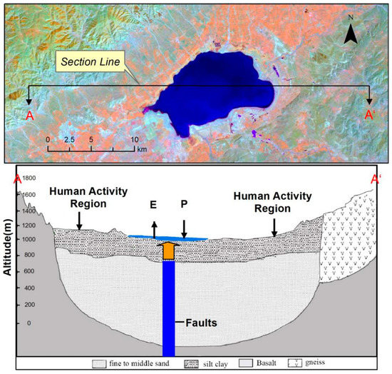 Faced the situation of shrinking lakes, there are two different perspectives on the relationship between water recharge and emissions. Firstly, local precipitation is the only source of recharge for these lakes. The supply of lakes receives rivers and groundwater runoff, all of which come from region rainfall in the basins [10]. Secondly, local precipitation cannot recharge groundwater through soil infiltration basically and the main source of recharge of lakes comes from exogenous groundwater. External groundwater recharges lakes through fault zones and other transmission channels of water [11,12]. For the first view, researchers calculated the amount of water that recharges into groundwater by precipitation infiltration into soil based on a hydraulic water balance model [13]. Nevertheless, the second view negated this opinion. Researchers verified their standpoint depending on isotope and hydrochemistry analysis. They assumed that groundwater recharge in the basin comes from precipitation, so the weighted average of hydrogen and oxygen isotopes of precipitation should be the same as that of groundwater. However, through experimental analysis, the isotopes of these lakes are obviously different from those of local precipitation and overly high soil salinity in the basin. It has been concluded that precipitation cannot recharge groundwater and lakes to receive a recharging of external water [14].