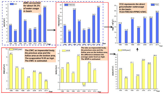 For the water flowing into the Daihai Lake, external water, precipitation, and runoff are the main resources. The hypothesis that rainfall infiltrates into groundwater recharge lakes has already been negated through the special phenomenon of change of the lake area in different seasons by remote sensing and has proven that this conclusion is a reliable the work of water chemistry. The runoff volume of the basin is only 6*103m3 yearly [13]. The supply of lake water is less, so it can be ignored. Therefore, water flowing into the lake can be reduced to surface precipitation and external groundwater (DGR). The water flowing out of the Daihai Lake, first of all the direct annual evaporation water consumption (EWC) the lake was calculated by evaporation of the basin, which is need to multiply conversion coefficient (0.55) [37]. Then, the Daihai Power Plant needs to consume lake water every year. Finally, there is about 9.12*107m3 of groundwater in the basin itself and this part of the groundwater has been extracted by people (TWCHA). Although the surface precipitation cannot infiltrate to form groundwater, the lake replenishes lost water of the basin to maintain the water balance in the basin. So, this element of artificial consumption is also part of the lake water consumption. The calculation method of parts of the indicators are more intuitive in Figure 12.