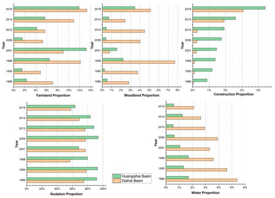 The inland closed lake environment is very sensitive to the feedback of climate change [45], we need to assess the impact of lakes on the surrounding environment. It can be seen Figure 5 that although both lakes have suffered from different degrees of shrinkage, the feedback from the Daihai Lake area to the whole basin is positive because the lake can maintain more water (Figure 14). We calculated these proportions and the proportion of buildings of Daihai basin is 1.19% lower than that of Huangqihai basin average year. In other words, that is the water consumption of agriculture and industry in Daihai basin will be lower than that of Huangqihai basin. The proportion of the total water area of Daihai basin is 2.47% higher than that of Huangqihai basin yearly. That is to say, the Daihai basin has more abundant water resources than the Huangqihai basin. More water resources directly led to an increase 2.64% and 2.70% of the farmland and woodland of Daihai basin compared to the Huangqihai Basin average every year. There is more woodland and farmland, so the proportion of nudation of Daihai basin is 11.80% less than the average of Huangqihai yearly. All in all, more water maintains a better ecological environment in the basins.