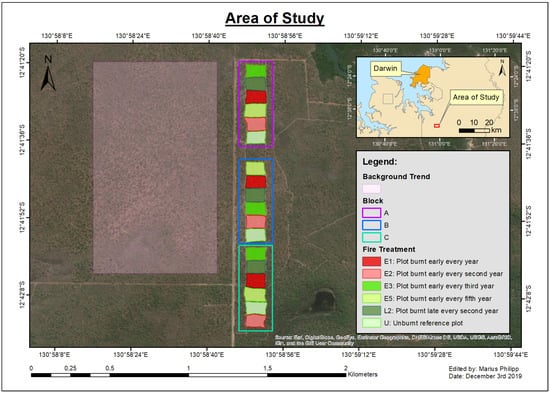 Our study took place in an established fire experiment in the open savanna woodlands of the Territory Wildlife Park, located approximately 50 km south of Darwin, Australia. The experimental fire treatments (line ignition) were established in 2004, whereby 18 one hectare plots were arranged in three blocks—consisting of 6 fire regime treatments with 3 factor replications []. The different treatments include early dry season burning every year (E1), every second year (E2), every third year (E3), and every fifth (E5) year. The remaining two treatments comprise burning late in the dry season every two years (L2) and exclude fire completely (U) (Figure 1).
