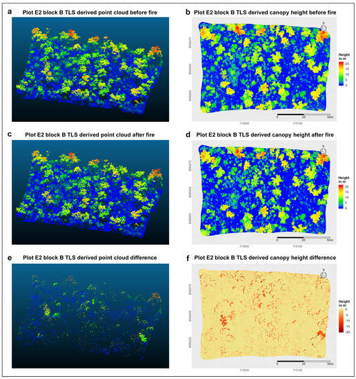 Terrestrial Laser Scanning (TLS) point clouds of plot E2 in block B after de-noising and thinning, together with TLS-derived canopy height rasters: LiDAR measurements shortly before (a,b) and shortly after (c,d) the experimental fires, as well as the respective differences (e,f) are displayed.
