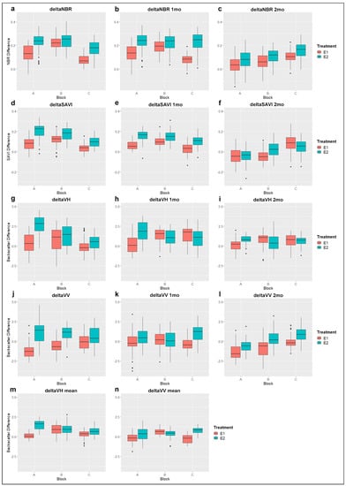 Sensitivity of optical (a–f) and Synthetic Aperture Radar (SAR) (g–n) indices to fire treatment effects on savanna vegetation visualized by box plots: The box and whiskers of each box plot are quartiles, with the band inside each box being the median value. Outliers are displayed as points. Based on the median values of each box plot, the majority of the predictors suggest higher burn severities for the E2 plots compared to the E1 plots. An increasing temporal difference between the before and after fire scenes lead to less consistent results among the data sets.