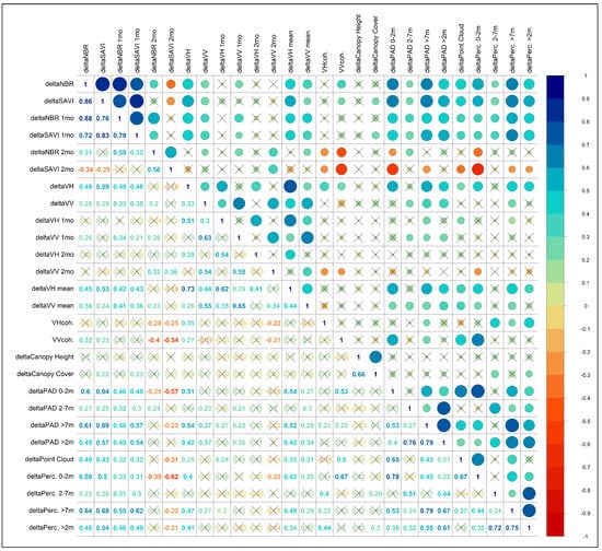 Correlogram displaying the correlation magnitude and direction between all predictors: Numbers range from −1 to 1, which is also visualized by the circle sizes. The colour coding further displays the degree of correlation as well as the direction (positive = blueish; negative = reddish). Central to this study is the correlation between “deltaNBR” (first column) and all other predictors. Values which are crossed out (X) are not statistically significant (p > 0.05).