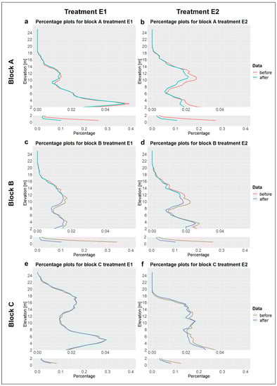 Analysing the difference between pre- and post-fire TLS data showed a general reduction in canopy resulting from the fires, but the magnitude of these effects differs among treatments and experimental blocks. Figure 5 visualizes the mean pre- and post-fire percentage profiles for each plot. The post-fire profiles show overall lower percentage numbers compared to the pre-fire profiles. Strongest differences between the before and after measurements are visible in the ground layer (0–2 m). Furthermore, differences between the percentage profiles are generally more pronounced for the E2 plots compared to the E1 treatment. Smallest changes were observed for plot E1 in block C (Figure 5e), while biggest changes can be seen within the ground layer (0–2 m) of plot E1 in block B (Figure 5c).