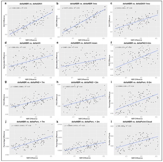 Relationships visualized by scatter plots between “deltaNBR” and other change indices derived from optical (a–c), SAR (d,e), and TLS data (f–l): Vertical foliage profiles from both the canopy layer and the ground layer performed best within the TLS predictors, while “deltaVH” backscatter showed the strongest correlation within the SAR predictors.