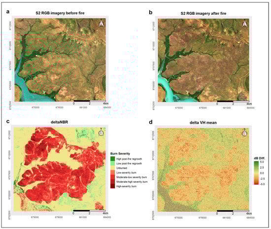 Example of larger-scale detection of savanna burn scar extent on the Tiwi Islands with optical and SAR sensors: Optical images before (a) and after (b) the fire are visualized. High burn severities as classified by “deltaNBR” (c) also stand out in the mean delta VH SAR image (d). Preprocessing of the shown radar image included thermal noise removal, radiometric calibration, terrain correction, and a conversion to dB. No speckle filtering was applied to the visualised SAR scene.