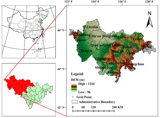 Midwestern Jilin Province is located in the southwest of Songnen Plain, the western area of the Inner Mongolia Autonomous Region, the eastern part of Horqin grassland, and the northern part of Heilongjiang Province, extending from a latitude of 43°16′N to 46°18′N and a longitude of 121°38′E to 127°45′E (Figure 1). It covers an area of 8.29 million ha, accounting for 44.23% of the land area of Jilin Province. The cultivated area is nearly 3 million ha, accounting for 75.1% of the cultivated area of Jilin Province [45,46]. It is an important part of the grain production base of Jilin Province, and is also the main region ensuring the safe production of grain throughout the whole province. Therefore, reducing the impact and loss of meteorological disasters on the agriculture in Jilin Province is an urgent task.