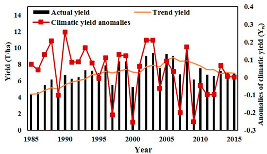 where is the anomalies of climatic yield; is the actual yield; is the trend yield. The interannual variation of climatic yield anomalies during 1985–2015 in Midwestern Jilin Province is shown in Figure 2, which shows negative value of climatic yield anomalies accounting for a large proportion in the study area.