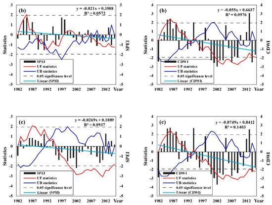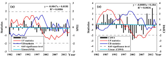 Figure 4 shows the temporal trends and abrupt change by year of the SPEI and CDWI in different growth stages for maize in Midwestern Jilin Province from 1982 to 2015. In general, the temporal trends showed a high similarity between the SPEI and CDWI, which decreased during each growth period of maize. During the periods from emergence to tasseling, the declining trend of both the SPEI and CDWI were not obvious, and the slopes of decline were −0.0047/year and −0.0085/year, respectively. Regardless of whether the SPEI or the CDWI is applied, the UF statistics were greater than 0 before 1997 and less than 0 after 1997, which indicated that the SPEI and the CDWI showed an upward trend before 1997 and a downward trend after 1997. The phenomenon is due to that from 1985 to 1992, there was more rainfall in May to July in Jilin Province, and waterlogging occurred for eight consecutive years. After 1997, with climate warming, droughts were more serious, and spring drought occurred for five consecutive years in Jilin Province since 2000 [59]. Although abrupt change changes based on year for both the SPEI and the CDWI occurred in 1993, these abrupt changes were not considered to be significant. From the histogram, the values of the SPEI and CDWI differed as follows: the CDWI showed a significant upward trend in 1985, whereas the SPEI showed an insignificant upward trend. According to historical data, high intensity rainfall occurred in Midwestern Jilin Province in 1985 because of typhoons “Lee” and “Minlie.” On 10 June 1985, the rainfall in Qianguo County reached 50 mm/h and the affected area of the cultivated land was 1.5 × 104 acres [60]. Typical historical waterlogging occurred in the study area in 1985 and 1986. In 2010 and 2013, the SPEI value did not reach the waterlogging status, but waterlogging occurred in the study area in these years based on the CDWI. As the data indicate, in July 2010, the south-eastern part of Midwestern Jilin province experienced a very rare rainstorm, and waterlogging disasters were affected by the northeast cold vortex and the high- and low-level jet streams. In 2013, the largest waterlogging occurred in Songhua River Basin and the disaster in Northeast China was severe, according to a report from the Jilin Provincial Department; the waterlogging disaster affected 78,000 ha of crops and caused direct economic losses of more than 47 million yuan. During the periods from tassel to milk maturity, some differences in the trends of the SPEI and the CDWI are shown. The SPEI demonstrated upward trends in 1982–1988 and 1998–2001, whereas the CDWI showed an upward trend in 1982–1992, and the SPEI and the CDWI both reached a significant growth trend in 1985. The significant difference between the two indices occurred between 2000 and 2010, and during this period Midwestern Jilin Province showed a normal state based on the SPEI, but most were in severe drought based on CDWI. According to previous studies, droughts in Jilin Province from 2000 to 2011, particularly in the western region, were serious, and the frequency of drought reached 98%. During the periods from milk maturity to mature, the trends of the SPEI and the CDWI were basically similar. There were both upward trends before 1994 and downward trends after 1994, and the downward trend reached a significant level of 95% after 2000 based on the two indices.