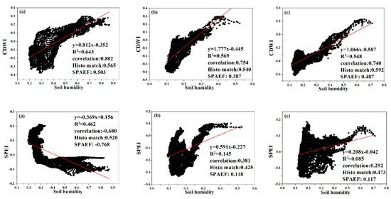 Scatter plots comparing spatial patterns between CDWI, SPEI, and soil humidity. Scores for the SPAEF components (histogram matching and correlation) are given in the graphs at different stages in Midwestern Jilin Province. (a–c) Represent the stages of emergence-tasseling stage, tasseling-milky maturity, and milky maturity-mature, respectively.