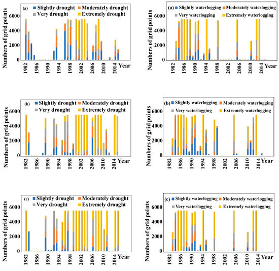 Years of drought and waterlogging in different growth stages for maize in Midwestern Jilin Province. (a–c) Represent the stages of emergence-tasseling stage, tasseling-milky maturity, and milky maturity-mature, respectively.