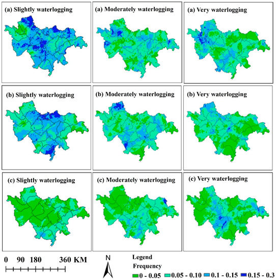 Spatial pattern of frequency of different waterlogging grades based on the CDWI from 1982 to 2015 at different stages in Midwestern Jilin Province. (a–c) Represent the stages of emergence-tasseling stage, tasseling-milky maturity, and milky maturity-mature, respectively.