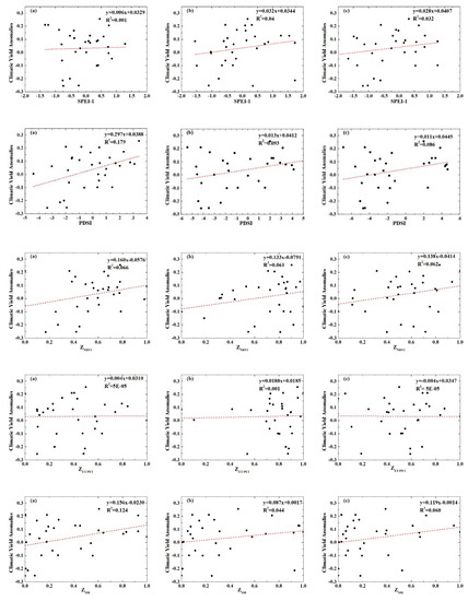 Scatter plot and linear fitting line among SPEI-1, PDSI, ZNDVI, ZET/PET, ZSM, and climatic yield anomalies for maize at different growth stages from 1985 to 2015. (a–c) Represent the stages of emergence-tasseling stage, tasseling-milky maturity, and milky maturity-mature, respectively.