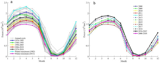 The landfast ice extent was averaged every ten years to analyze the interdecadal variation, as shown in Figure 2a. In the 1976–1985 interval, the maximum extent was 2.1 × 106 km2, which decreased to 1.9 × 106 km2 in the 1986–1995 interval, to 1.74 × 106 km2 in the 1996–2005 interval and to 1.66 × 106 km2 in the 2006–2018 interval, which showed that the winter extent suffered a continuous decrease in the last decade compared to the study period (1976–2007) of Yu et al. [25]. The maximum extent for 2008–2018 interval in the Figure 2b was 15% smaller than that for 1976–2007 interval. Every single year in the extended time series during 2008–2018 showed a smaller extent than the mean for 1976–2007 interval, both in winter and summer. The occurrence of almost landfast ice free summers were becoming regular, and the decrease trend indicated that landfast ice may disappear in the next half century during summer and autumn.