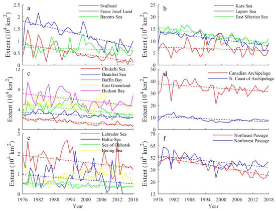 Long-term trend of landfast ice extent in the 17 subregions (a–e), Northeast Passage and Northwest Passage (f) during 1976–2018.