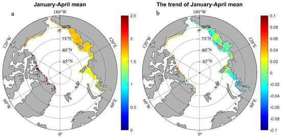 The NSIDC CryoSat-2 monthly ice thickness dataset covers January to April from 2011 to 2018. The mean landfast ice thickness during January to April is illustrated in Figure 8a. The landfast ice thickness in the Northeast Passage showed clear spatial variations and is thicker (1.5~2.0 m) in the Laptev Sea and East Siberian Sea, and thinner (1.0–1.5 m) in the Kara Sea. In the northern Canadian Archipelago and the coast of the Beaufort Sea, the large ice thickness, up to 2.0–2.5 m, corresponded to multi-year ice and showed an obvious increasing trend from 2011 to 2018 (Figure 8b). The trend in the January–April mean ice thickness in the Northeast Passage along the Russian coast was dominated by a decreasing trend. Considering the fact that sea surface temperature in the Northeast Passage experienced a cooling trend in the past 30 years [44], the gradual warming of surface air temperature should be responsible for the decreasing trend of landfast ice thickness.